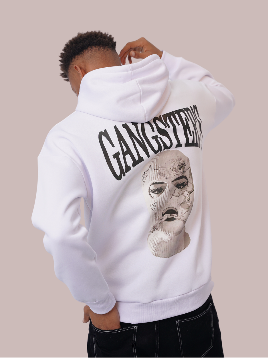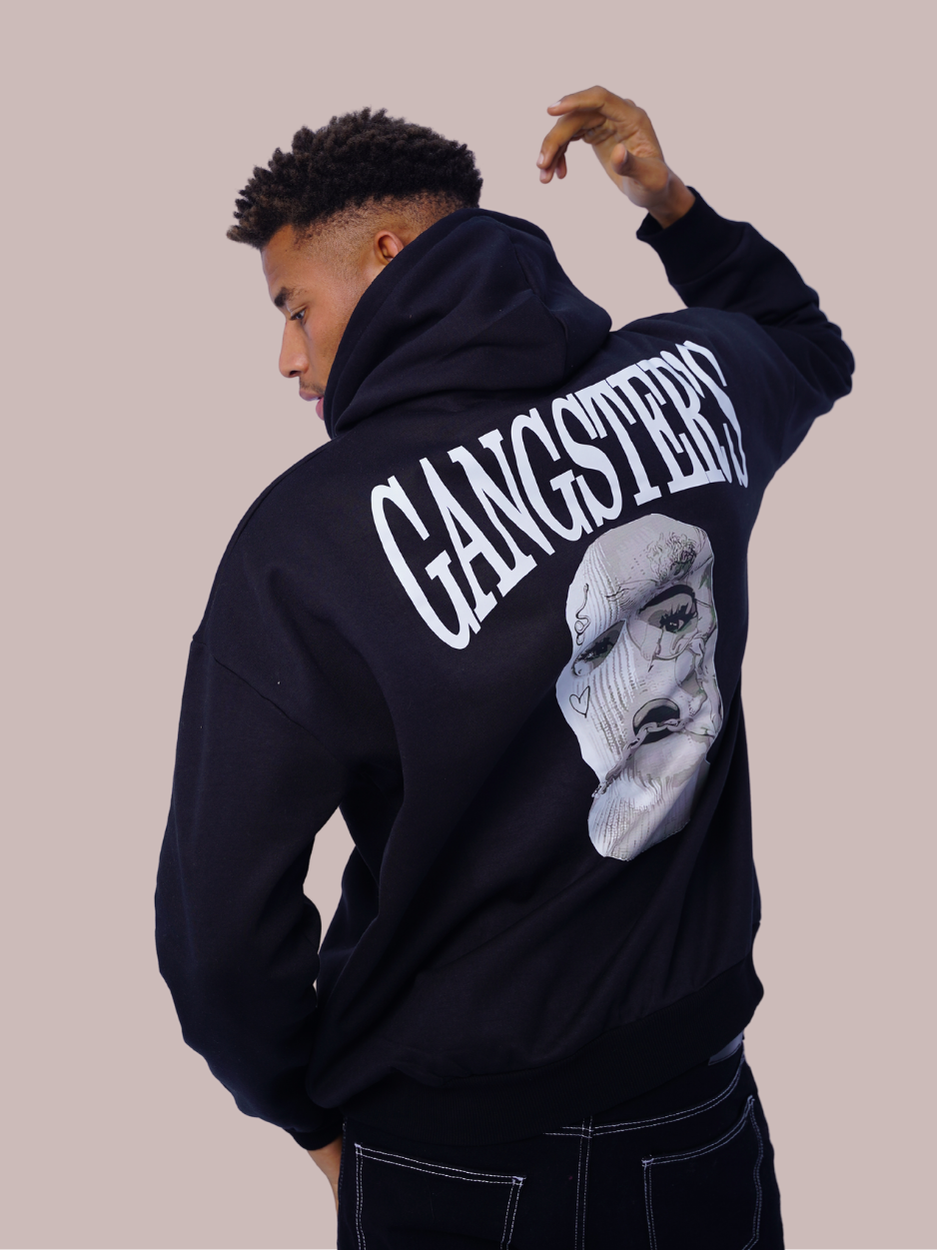 Sweat à capuche GANGSTERS oversize de couleur noir et blanc, conçu pour un style urbain et moderne.
